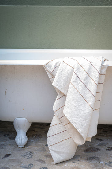 Inspired by the bold horizontal layering seen in geological formations, our Strata collection is born in the arid Karoo, South Africa. This hand-loomed bath towel is made from 100% local, unbleached cotton with amber and ochre pinstripes. Rustic yet stylish, it will add that extra layer to your bathroom space.