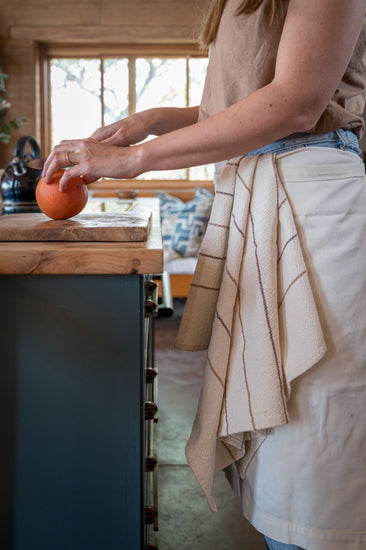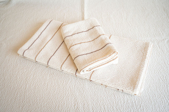 Inspired by the bold horizontal layering seen in geological formations, our Strata collection is born in the arid Karoo, South Africa. This hand-loomed hand towel is made from 100% local, unbleached cotton with a subtle amber and ochre pinstripes. Rustic yet stylish, it will add that extra layer to your bathroom or kitchen space.