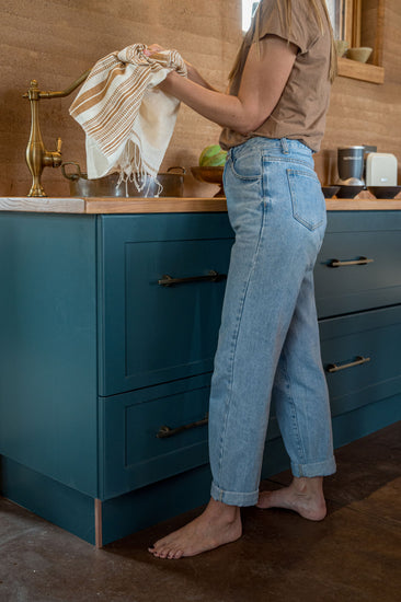 Hand-woven unbleached cotton, which is lightweight, absorbent and quick drying