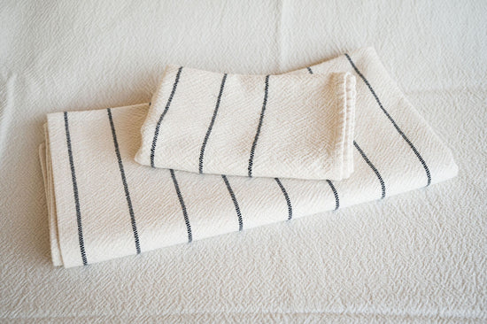 Inspired by the bold horizontal layering seen in geological formations, our Strata collection is born in the arid Karoo, South Africa. This hand-loomed hand towel is made from 100% local, unbleached cotton with black pinstripes. Rustic yet stylish, it will add that extra layer to your bathroom or kitchen space.